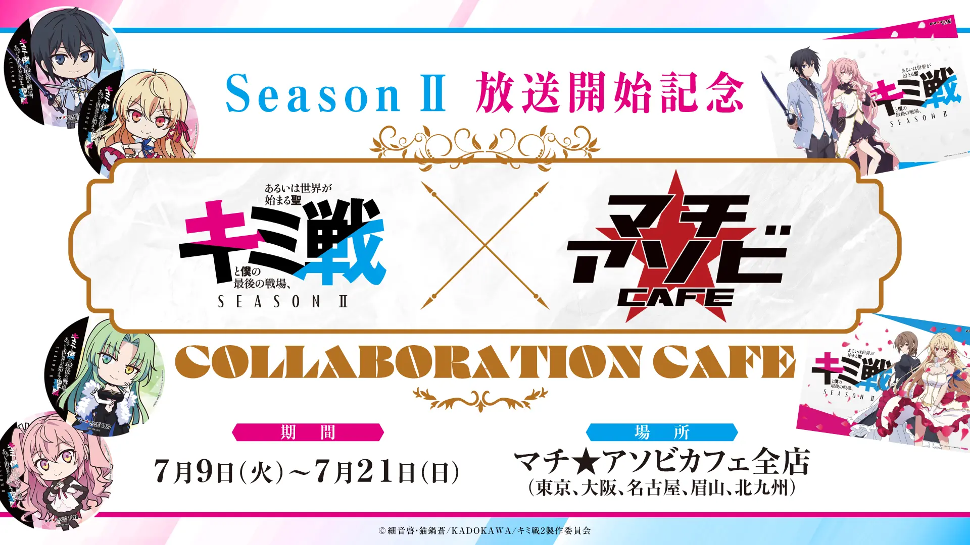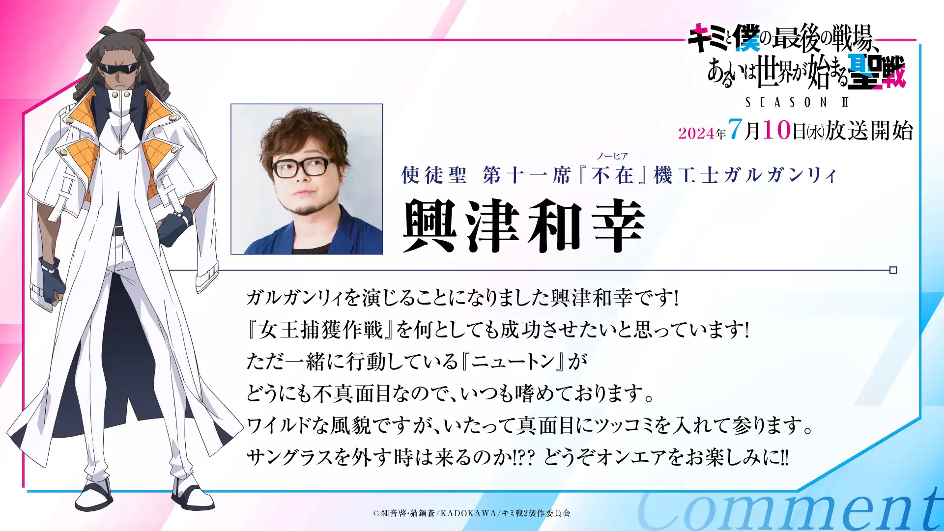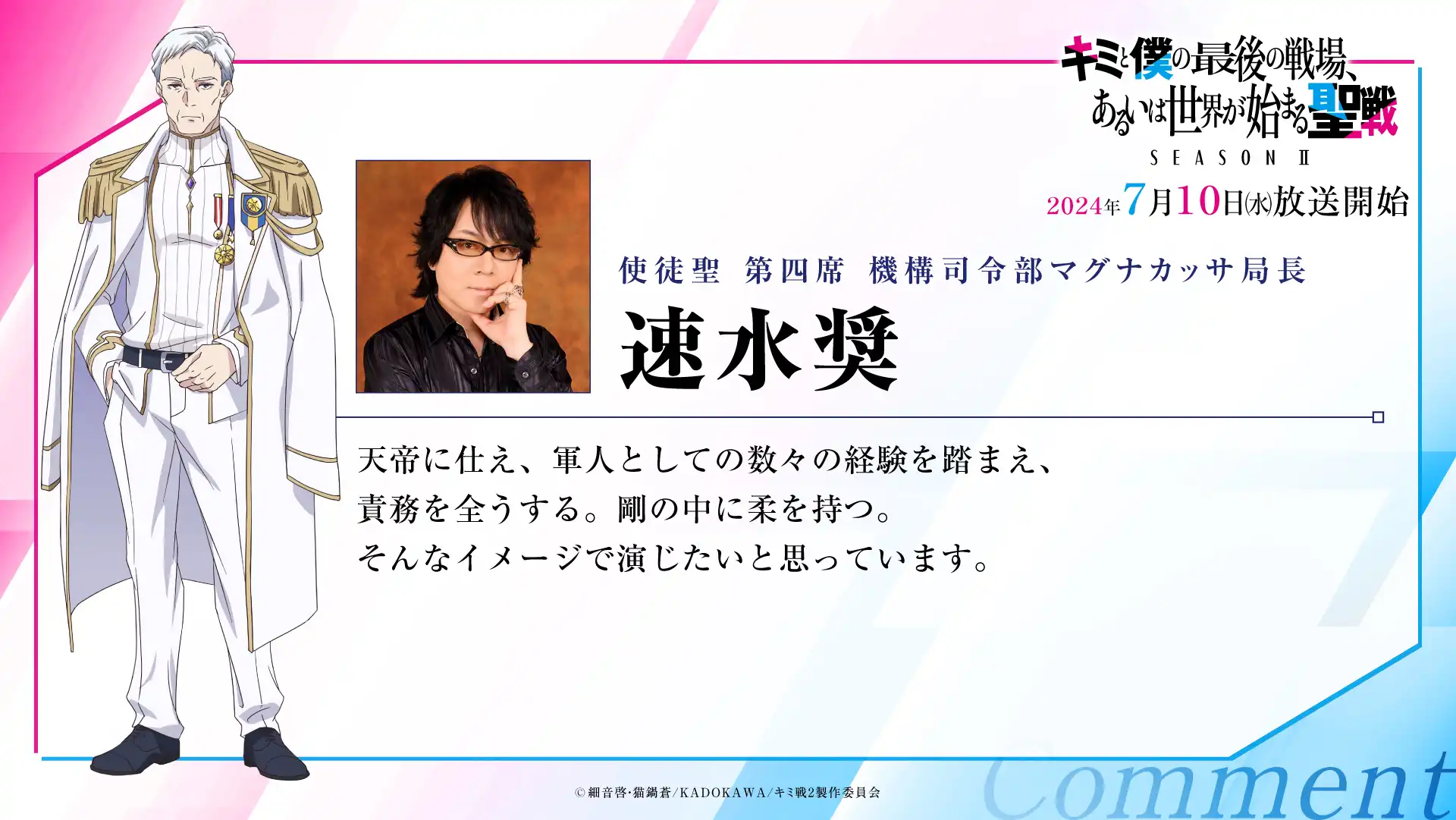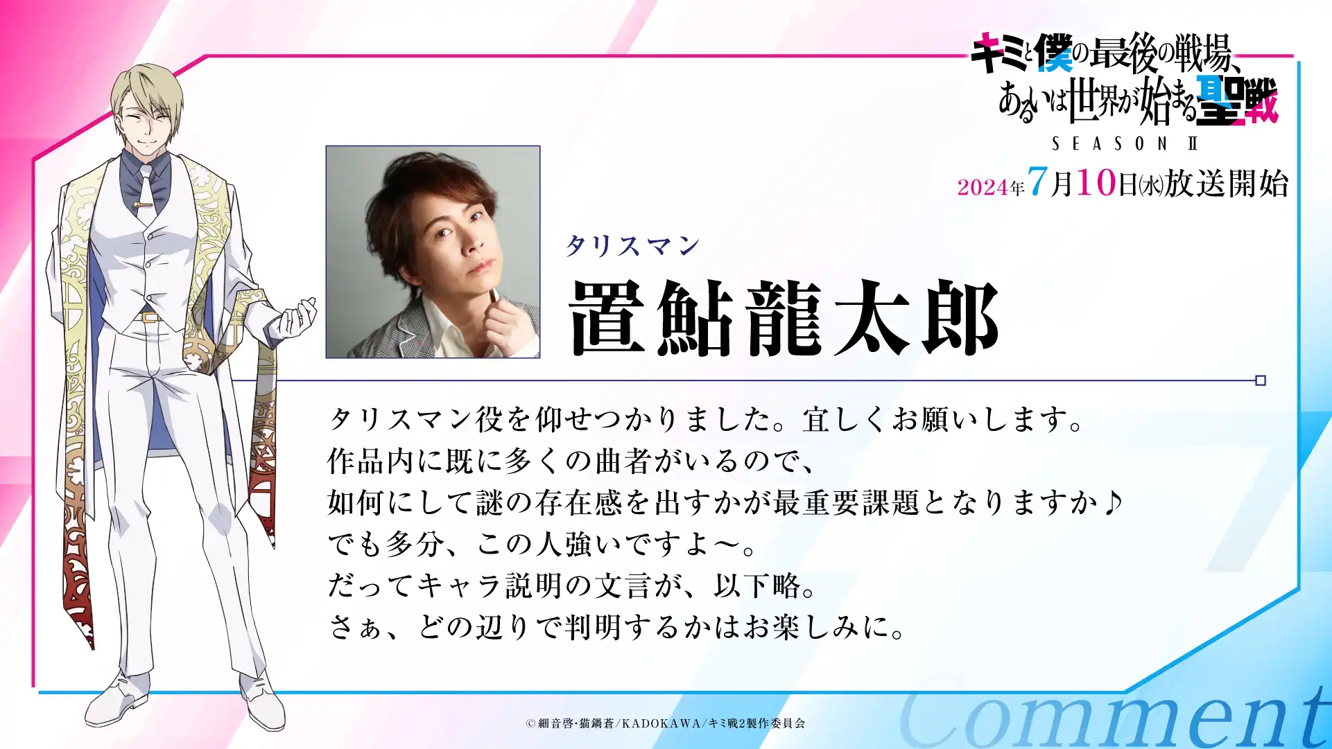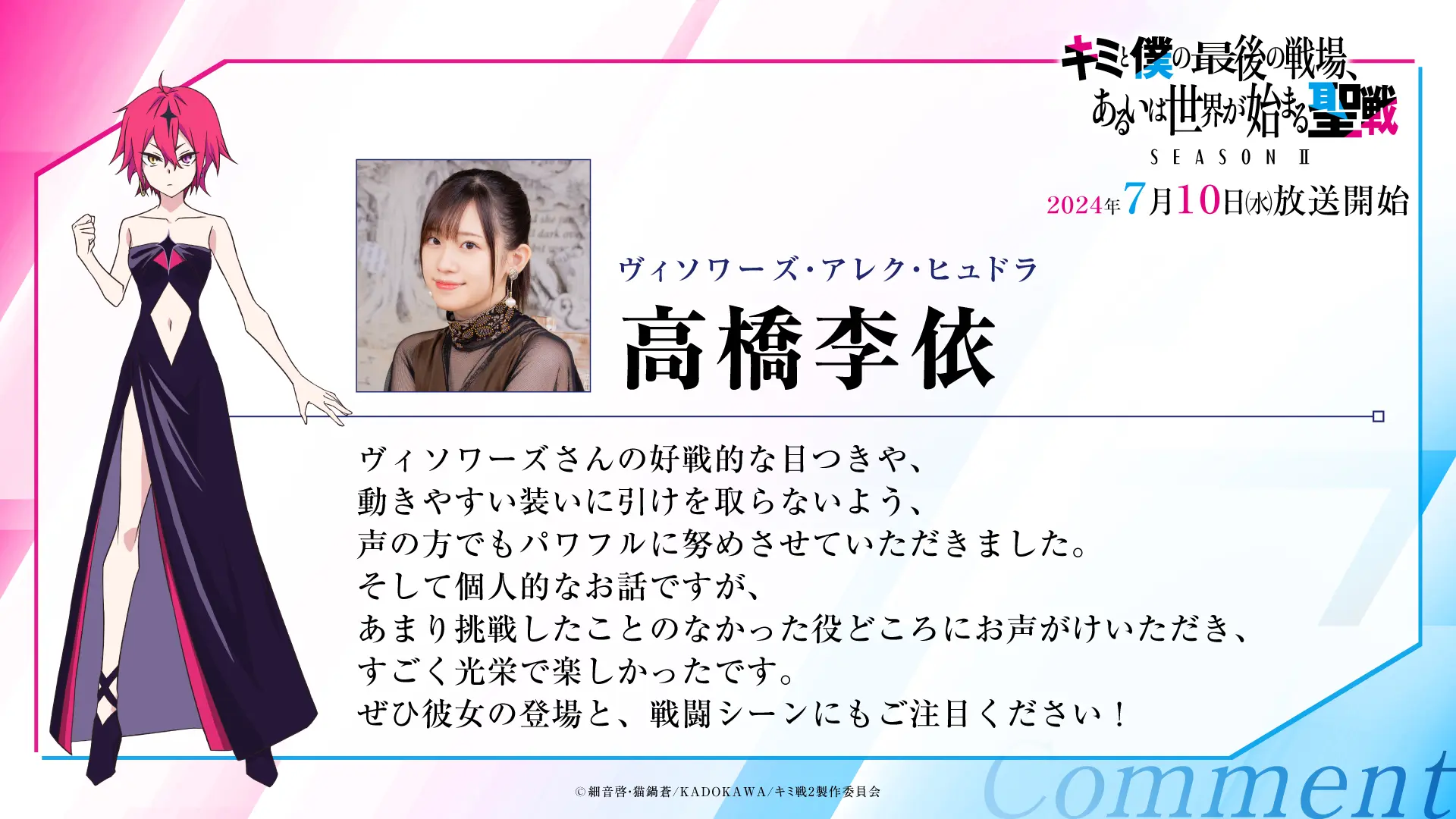 『キミと僕の最後の戦場、あるいは世界が始まる聖戦 Season Ⅱ』全12話の放送完結を記念して、小林裕介さん、雨宮天さん、白城なおさん、石原夏織さん、土岐隼一さん、花守ゆみりさん、和氣あず未さんの7名よりコメントが到着しました。 Season IIを応援いただきまして、誠にありがとうございました。引き続き作品の応援をよろしくお願いいたします。